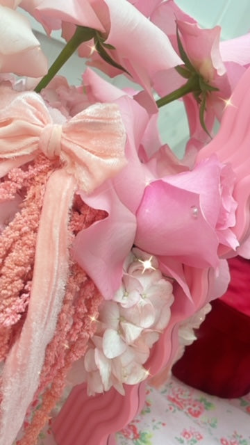 Indulge your senses with this luscious arrangement of soft pink roses and hydrangea. Garnished with hanging amaranthus and adorned with bows, this piece is sure to send their heart soaring.